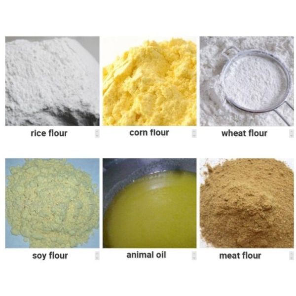 Raw material : rice flour, corn flour, fish meal, bone meal etc